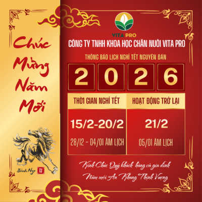 Nhân dịp Xuân mới Tết Nguyên Đán 2026, Công Ty TNHH Khoa Học Chăn Nuôi Vita Pro xin gửi lời tri ân chân thành đến Quý Khách hàng và Quý Đối tác đã luôn tin tưởng, đồng hành và ủng hộ các sản phẩm – giải pháp chăn nuôi của Vita Pro trong suốt thời gian qua.