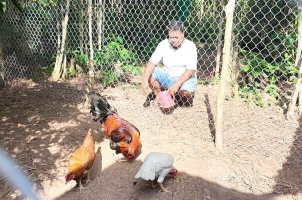 Anh Chau Đinh chăm sóc đàn gà lai Mỹ – Thái trong khu vườn tầm vông