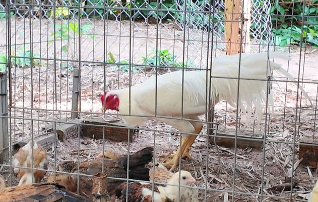 Gà trống lai Mỹ – Thái hơn 6 tháng tuổi có vóc dáng vạm vỡ, lông trắng nổi bật, được tuyển chọn làm giống tại trại gà của anh Chau Đinh